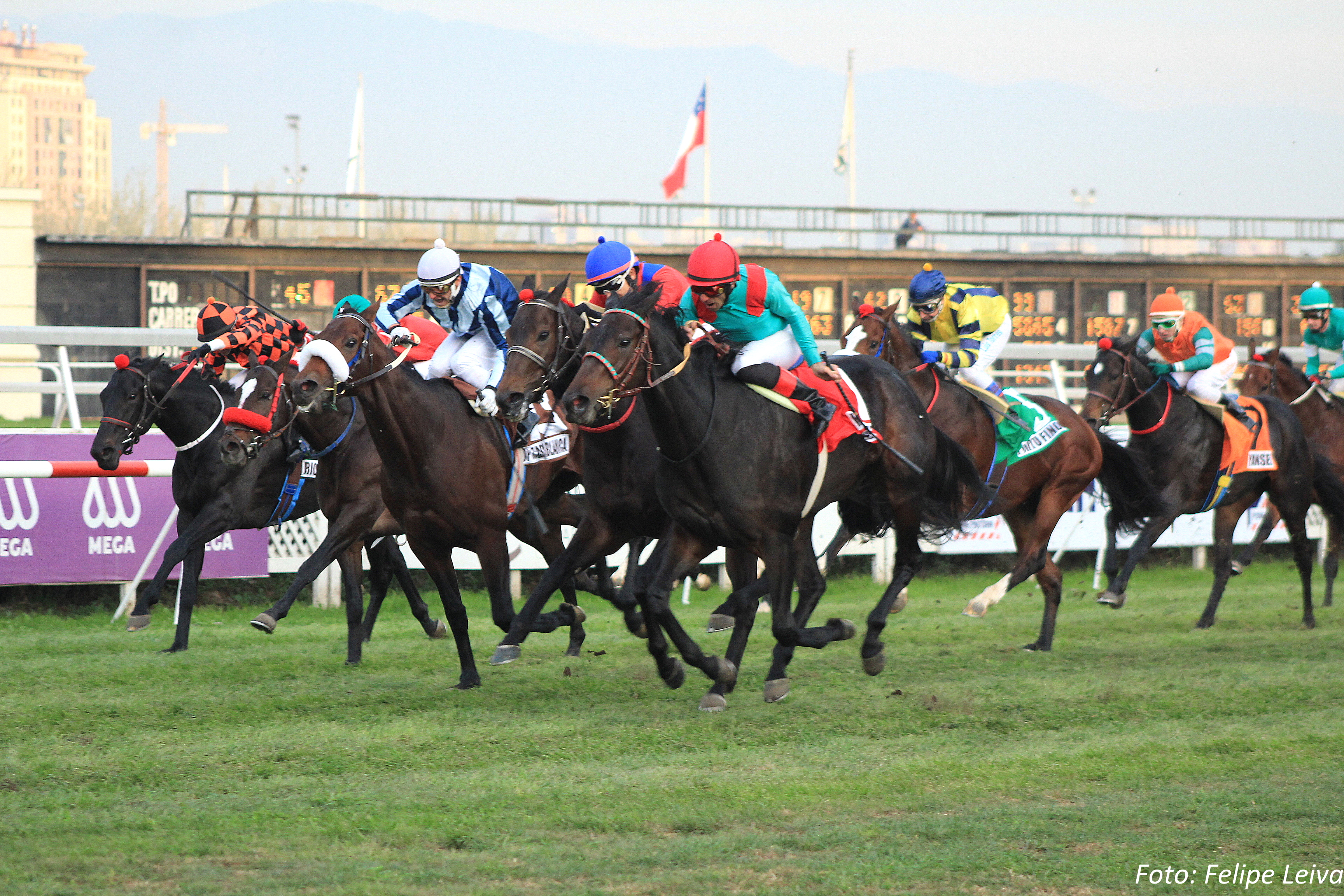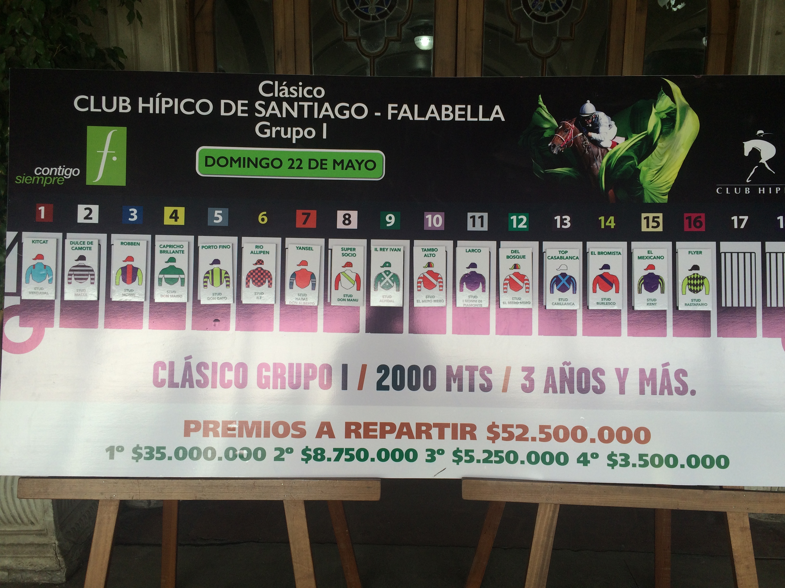 I wandered up a set of stairs into one of the entrances to the grandstands. I photographed a board with post positions for the Clásico Club Hípico de Santiago-Falabella. A guy close to my age walked past carrying a camera. A tag with the word “Gráfico” (photographer), hung from his neck. This was my soon-to-be new friend Felipe, whose photos from the race you will see below.