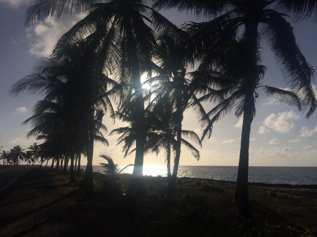 The setting sun shined through the palm trees of the west shore, silhouetting them as we walked to and from the supermercado. Day 2 – check. Day 3 >>