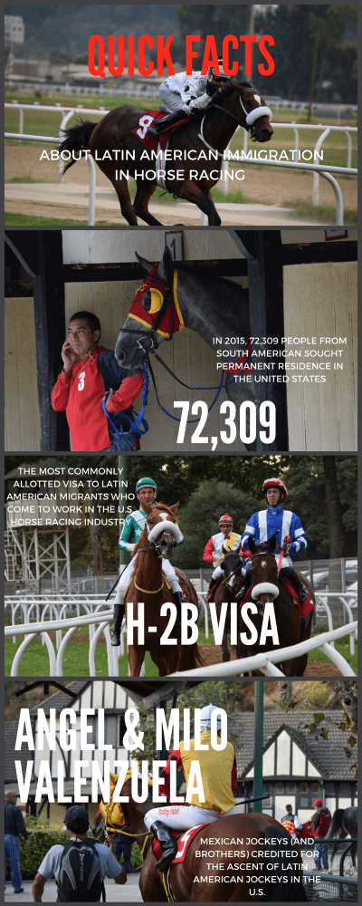 Diving further into the topic of work visas issued to immigrants from Latin American countries, the recent immigration raids ordered by the Donald Trump administration could potentially have an effect on U.S. racetracks, due to the high percentage of undocumented workers from Latin America (Ross, 2017). Three possible visa options for backstretch workers, as outlined by Ross 2017, are the H-2B visa – which was the most commonly referenced throughout the article and is capped at 66,000 a year – The P1A, which is available minimally to workers and is geared more toward professional athletes such as jockeys, and the EB-3 visa, a petition for permanent residency.