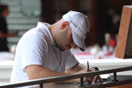 Ramiro Restrepo, Latin American Market Representative for Fasig-Tipton, focused on his work at the 2016 Saratoga Select Yearling Sale. Linzay Marks photo